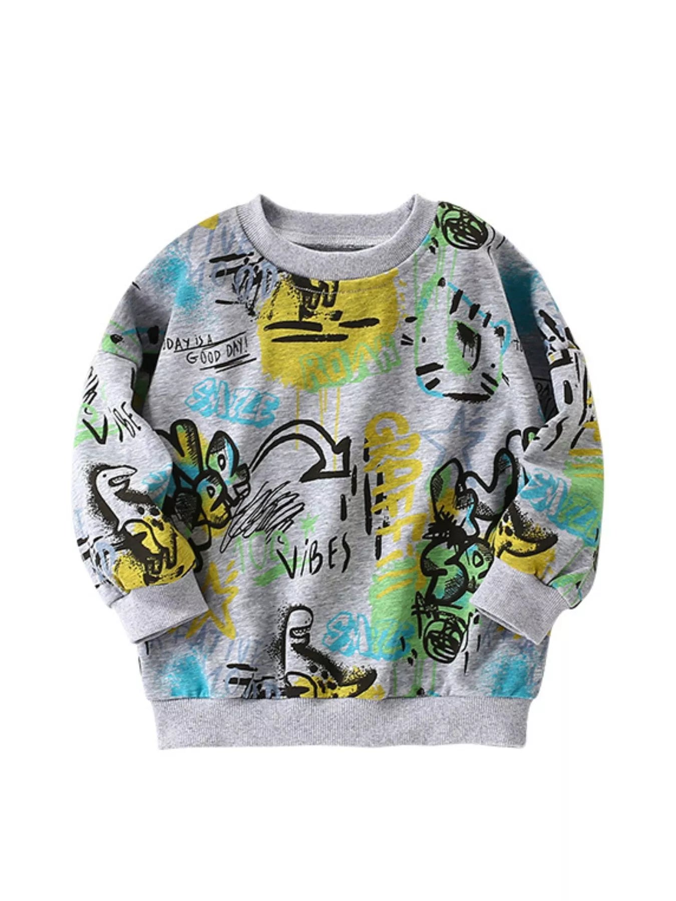 Children's Cartoon Graffiti Print Crew Neck Sweatshirt
