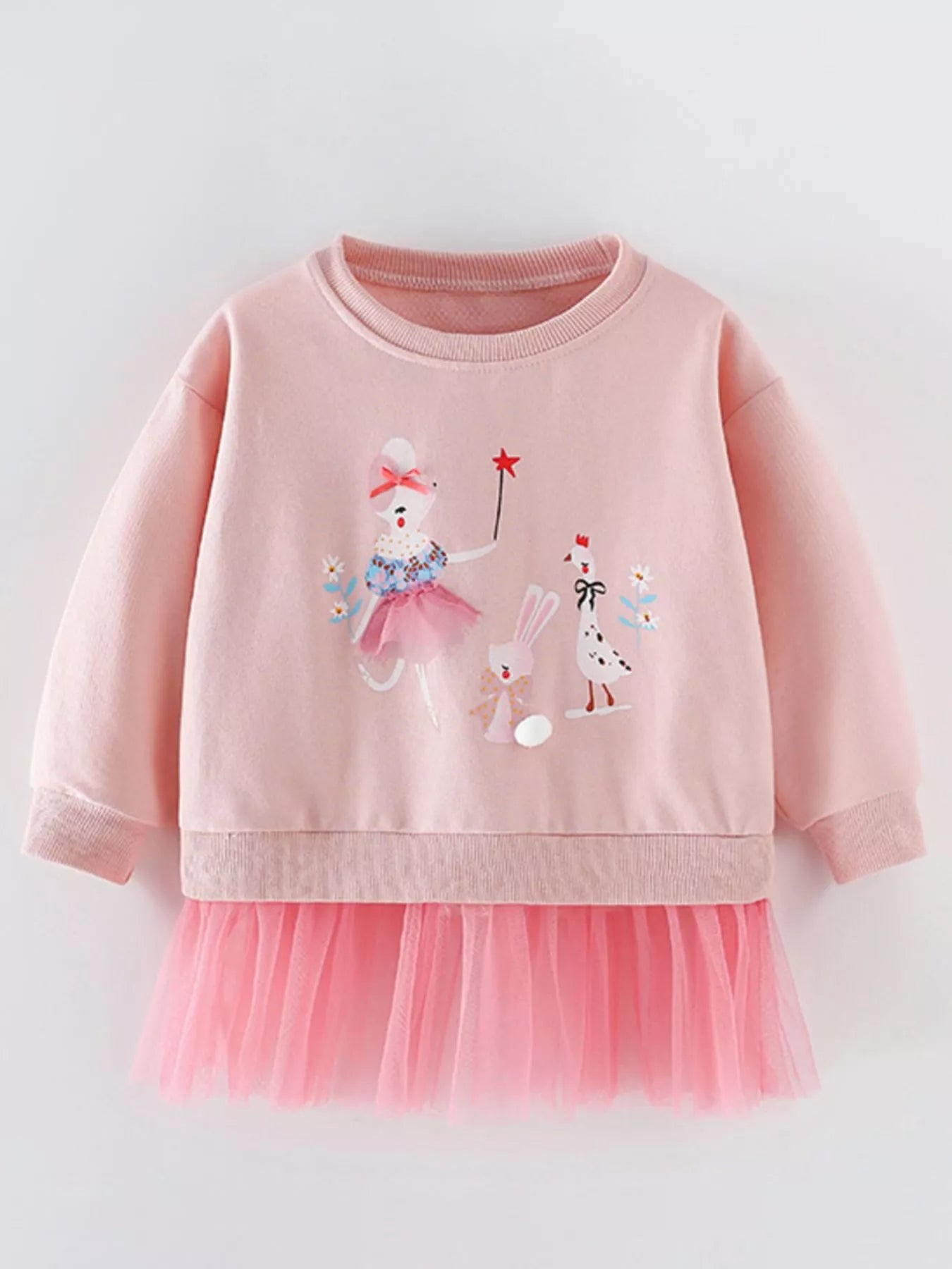 Children's Cartoon Round Neck Tulle Hem Sweatshirt