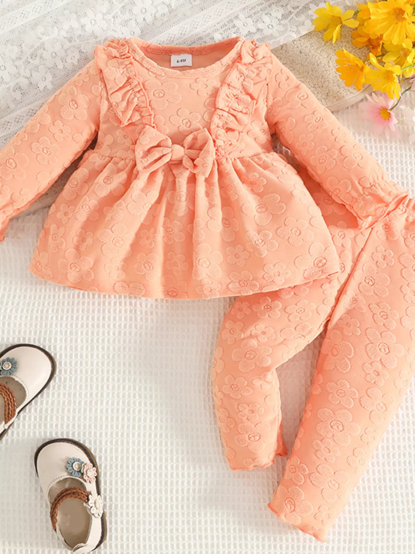 Children's Floral Embossed Ruffle Trim Top and Pants Set